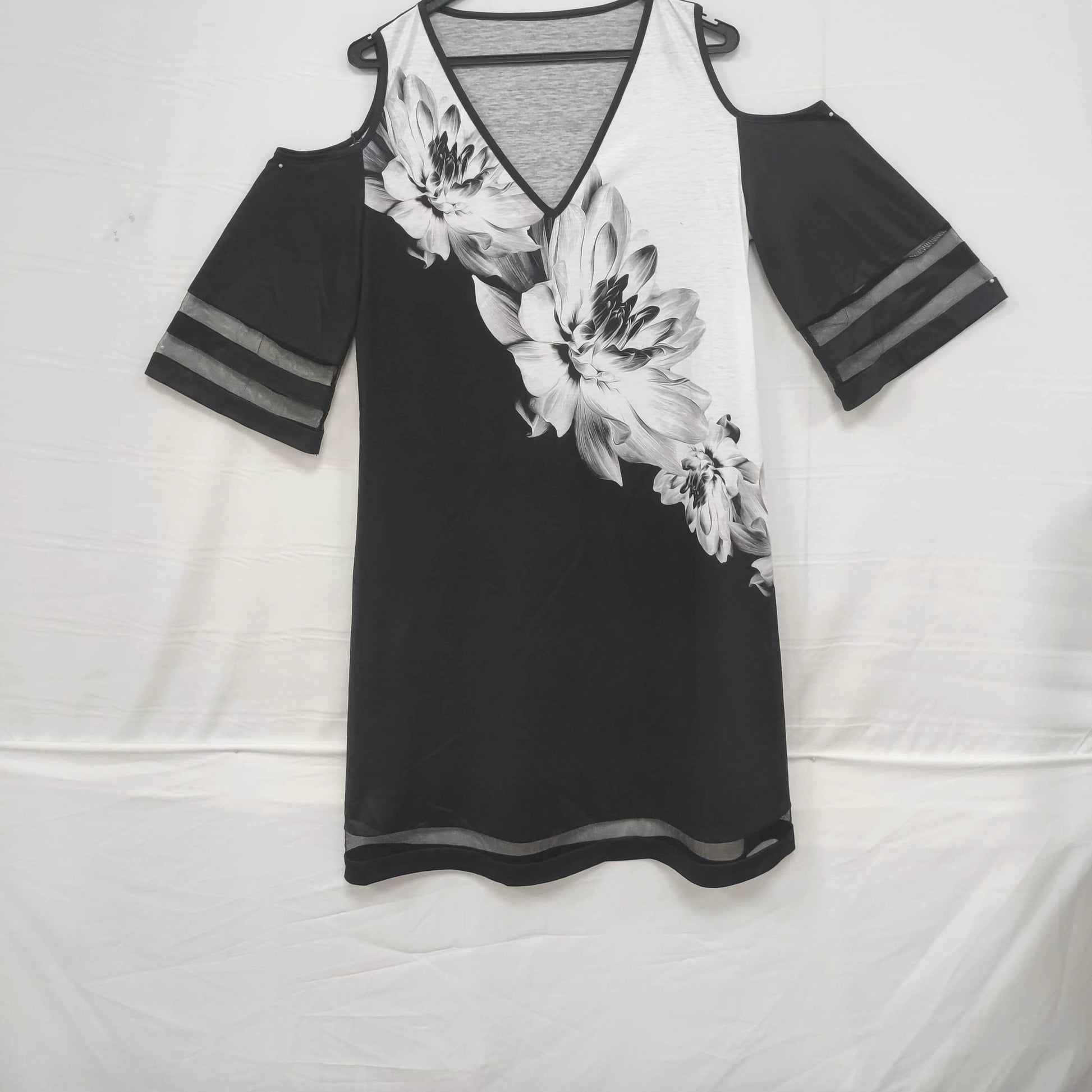 Ladies' Abstract Printed Color Blocked Off Shoulder Contrasting Mesh Casual Dress